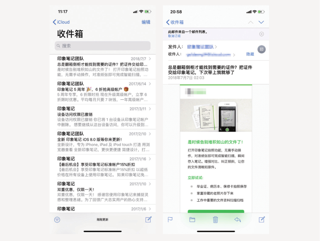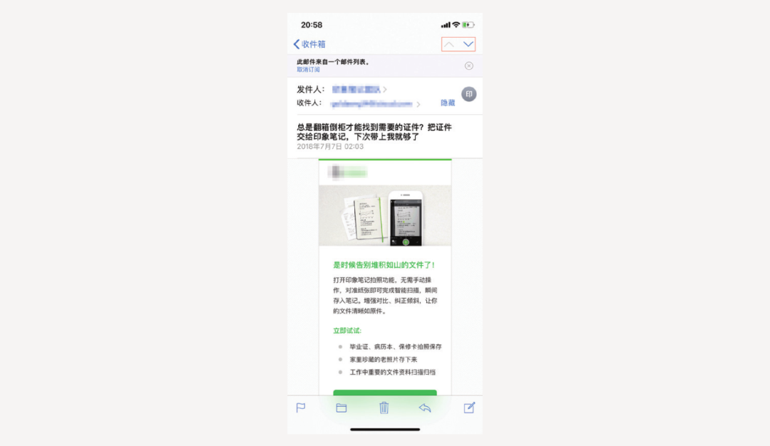 例如,用户在使用iOS原生邮箱时,可以通过右上角的上下箭头快速查看上一封邮件和下一封邮件,而不需要回到列表后再点击查看,如下图所示。