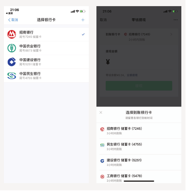 而当用户在使用微信提现功能时,系统会直接在提现页面中展示一个选择银行卡的浮层,这样可以减少页面跳转,使操作更加简单、高效,如右图所示。