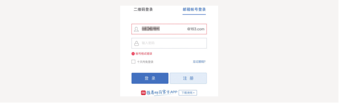 例如,用户登录网易邮箱,在输入框中输入邮箱账号,之后让光标离开输入框,如果用户输入的账号格式错误,系统会提示用户账号格式错误,如下图所示。