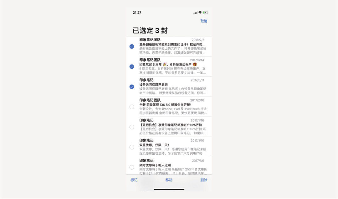 例如,用户在使用QQ邮箱APP时,如果想要对多封邮件进行标记或移动,就可以先进行批量选择,再进行对应操作,如下图所示。