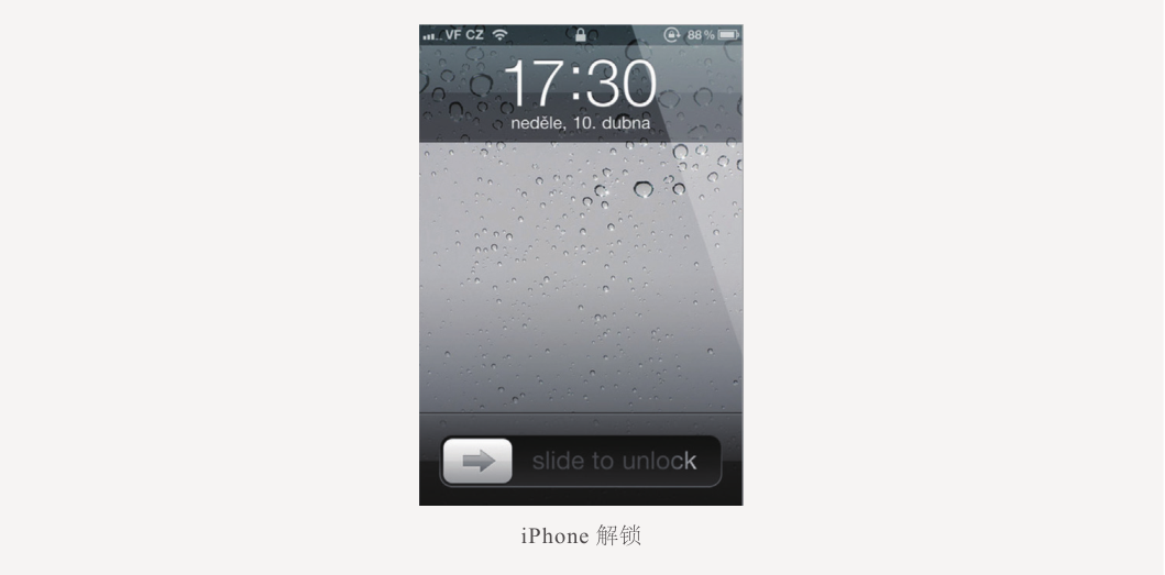 例如,iOS 6之前版本的iPhone系统中的“移动滑块解锁”这个设计就非常贴合人们的日常生活认知,用户上手成本极低,如下图所示。